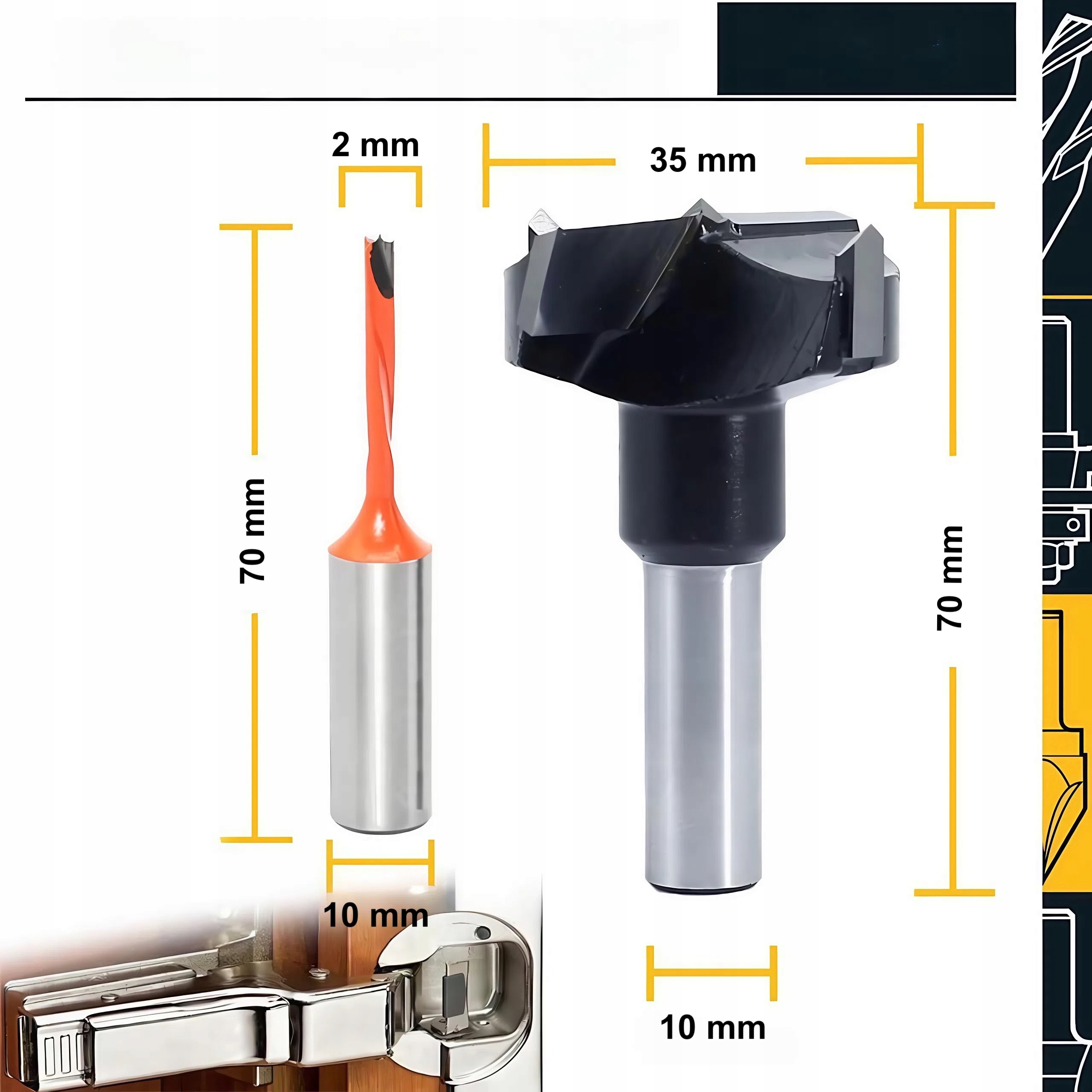 🔧 Zestaw wierteł do produkcji mebliWiertła HM 2,0×70 mm LEWE trzpień ścięty 10 mm (2 szt.) + frez puszkowy 35x70 mm trzpień ścięty 10 mm Praktyczny zestaw narzędzi stolarskich przeznaczony do wykonywania otworów pod zawiasy puszkowe meblowe 35 mm BLUM