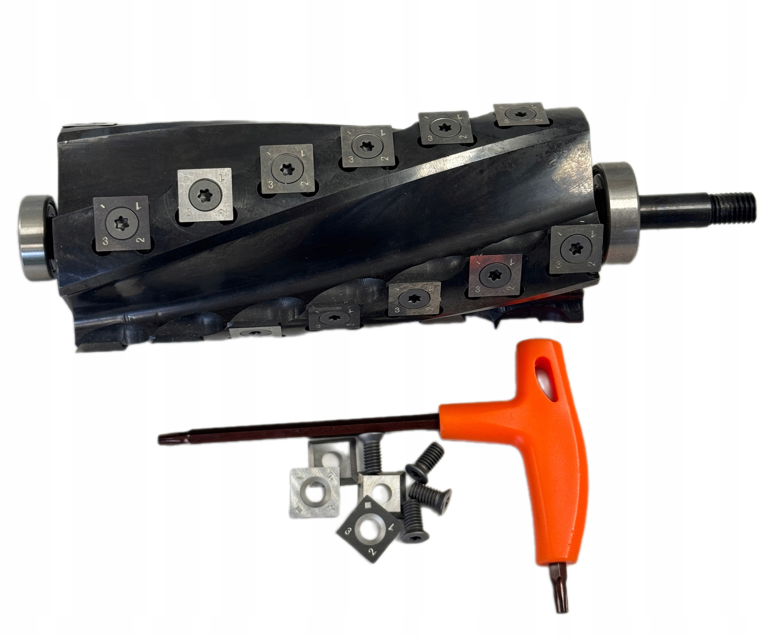 W zestawie frez z zamontowanymi dwoma płytkami, klucz do zamontowania płytek, plastykowe pudełko do przechowania.